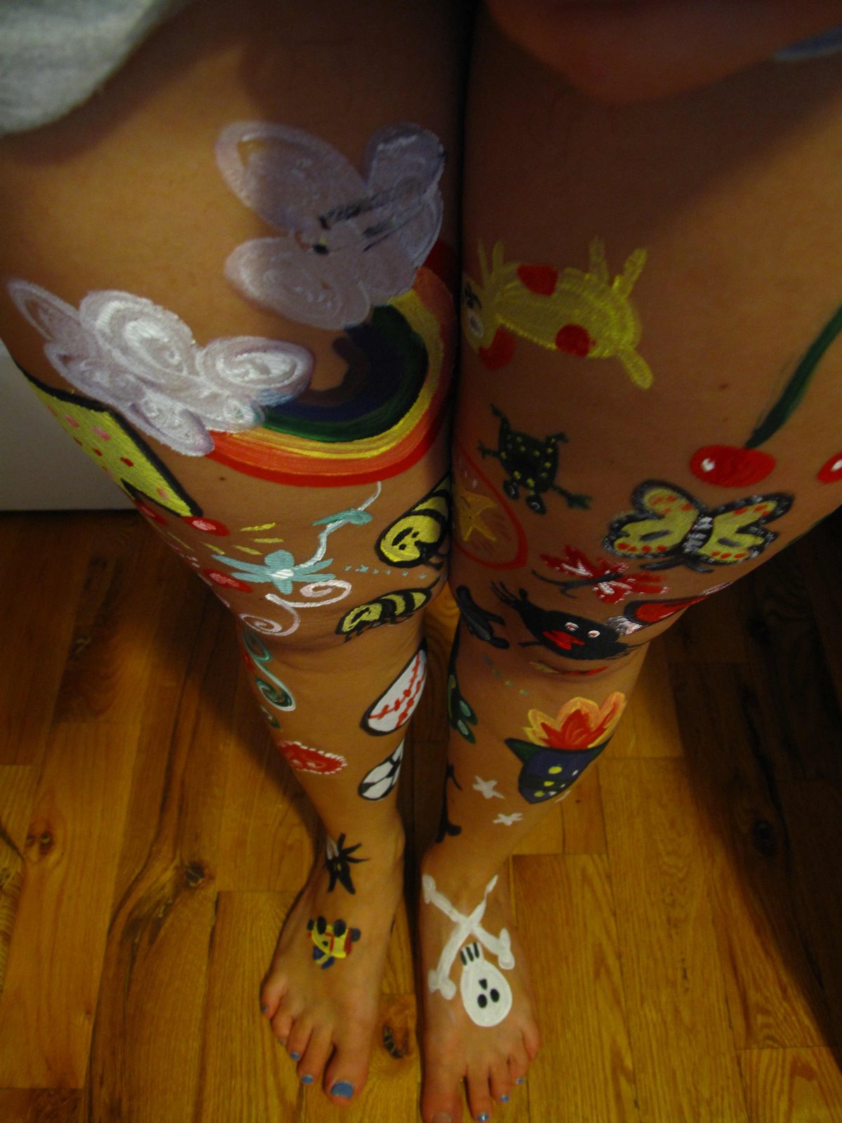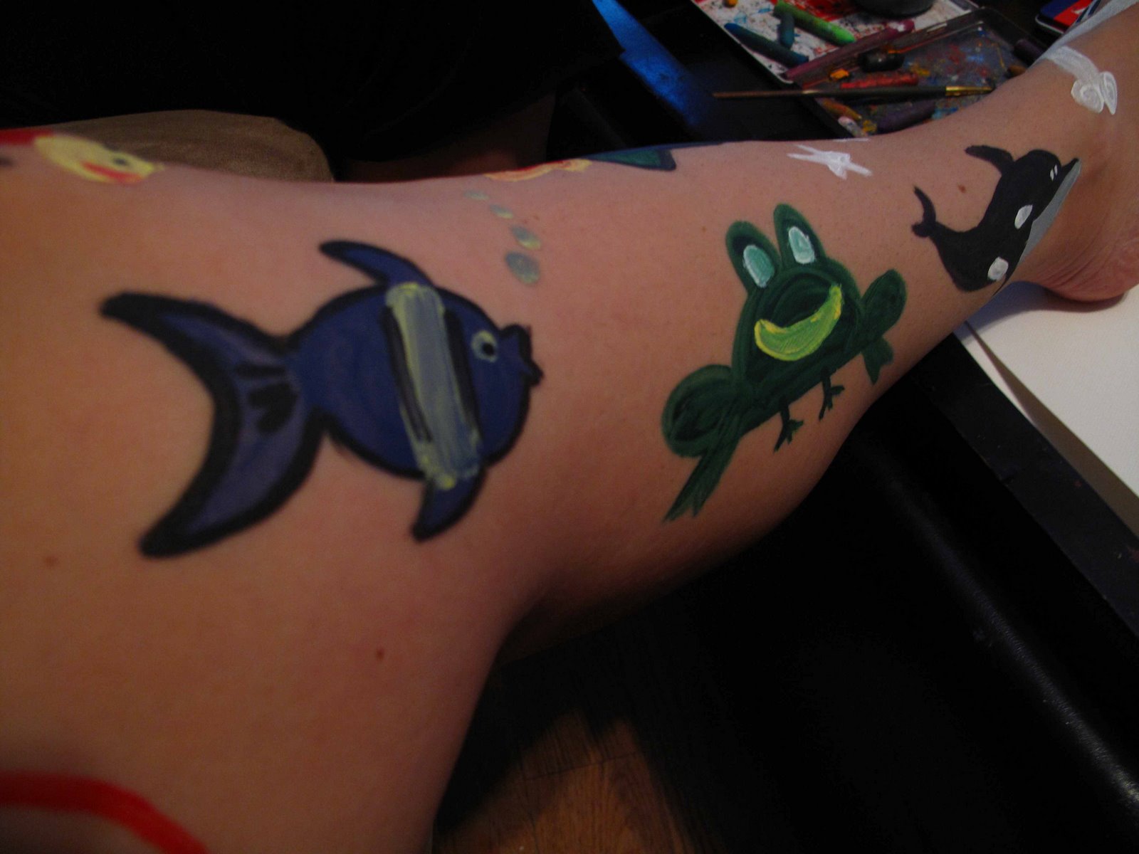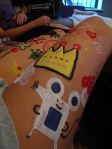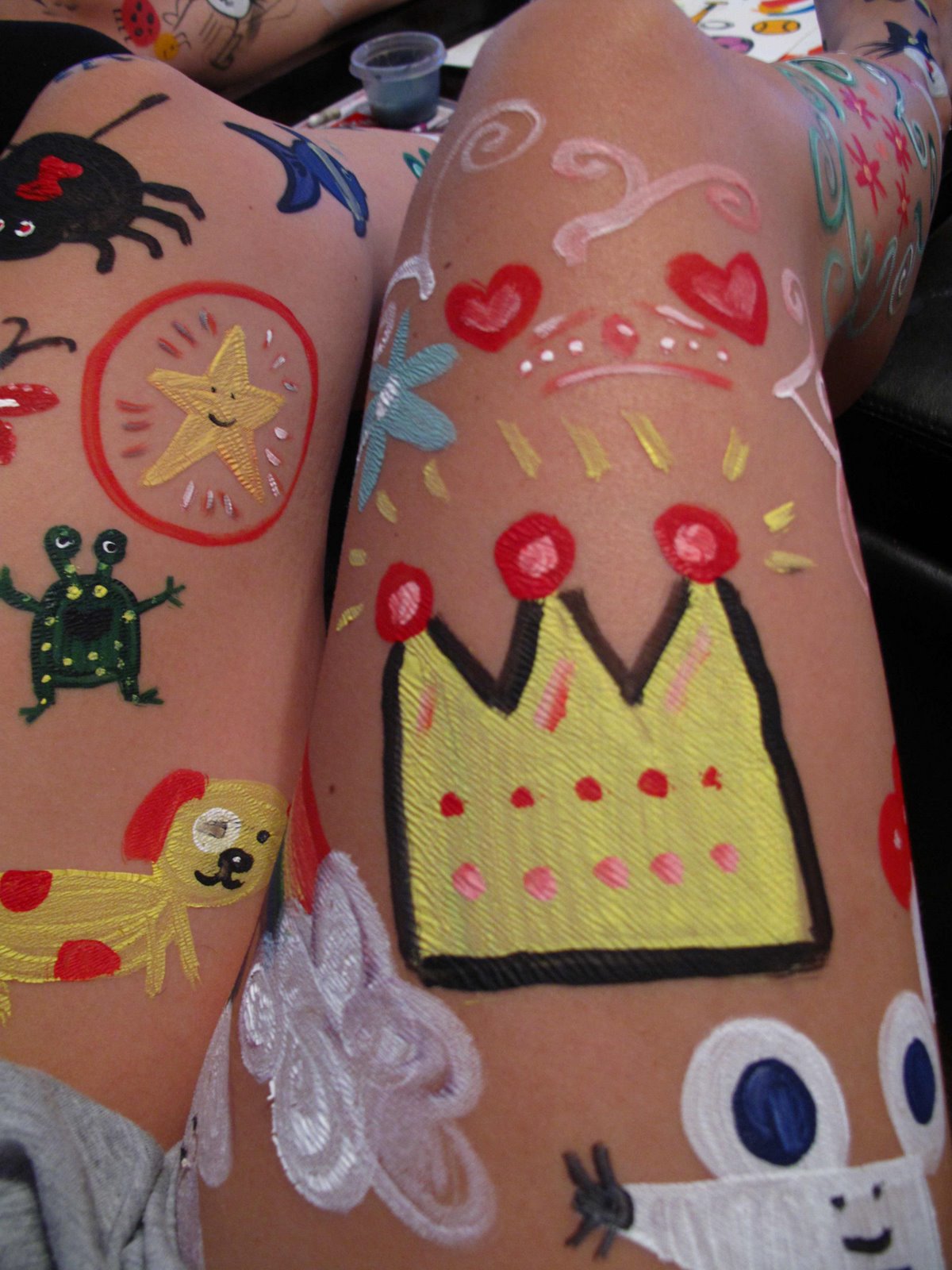 On a recent afternoon, we shopped for Snazaroo paints and brushes and even got crazy containers to store it all at the Container Store. Then we came home to practice by copying a book … but instead I used acrylic paints (toxic, whatever … they were on me!)