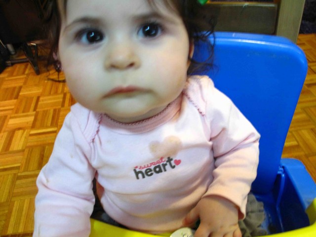In the trifecta of heart signs … earlier this evening the baby girl was finishing her mushy dinner and daddy invited me to come look at her shirt. A stain in the shape of a heart.