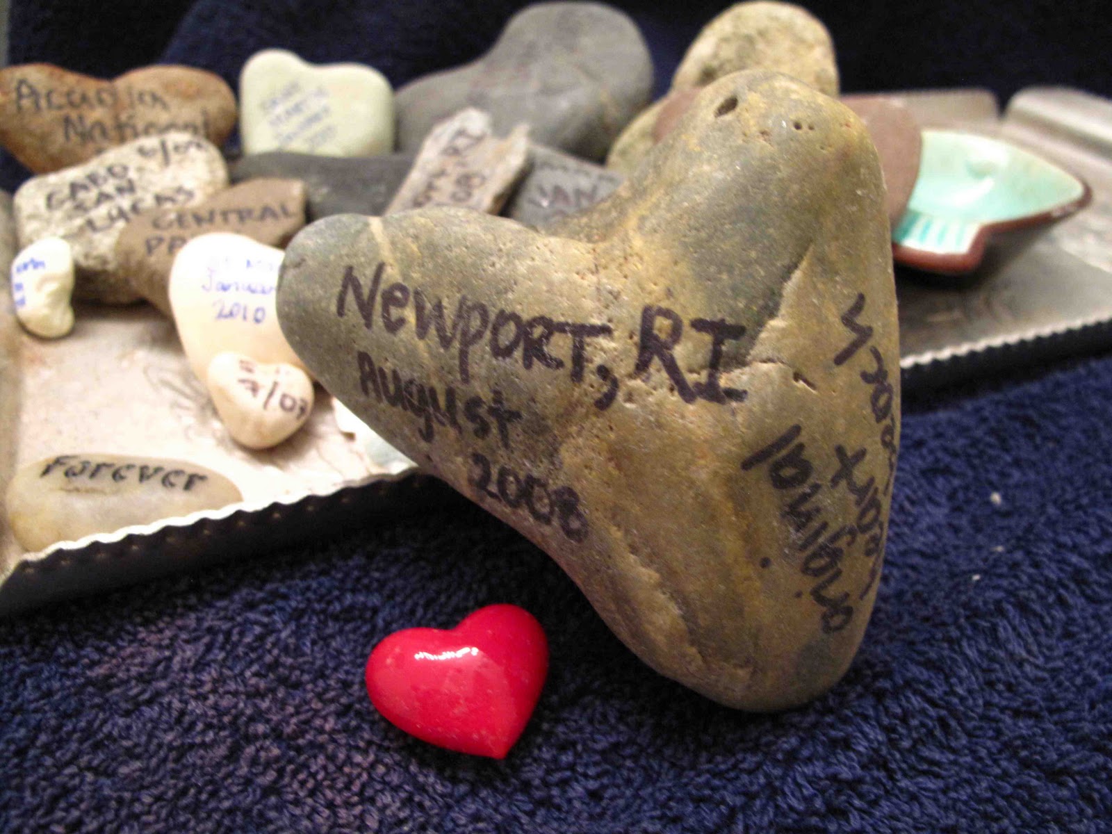 In August 2008 on our way home from our first trip to Maine, we stopped in Newport, Rhode Island. While stopping at a beach along the Cliff Walk, we ran into a woman looking for heart-shaped rocks along the predominantly-pebbled beach. It seemed like the perfect idea for someone who authors a blog called Hearts Everywhere. Thus the hobby was born. I’ve been collecting them through life and travels. I write the date and where I found it. They live in the bathroom that used to be just mine before it became just mine and the baby’s. The girls’ room.